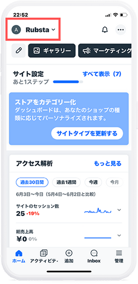 複数サイトがある場合はサイト名横のプルダウン( )を開くと、ホームページ一覧が表示されます。